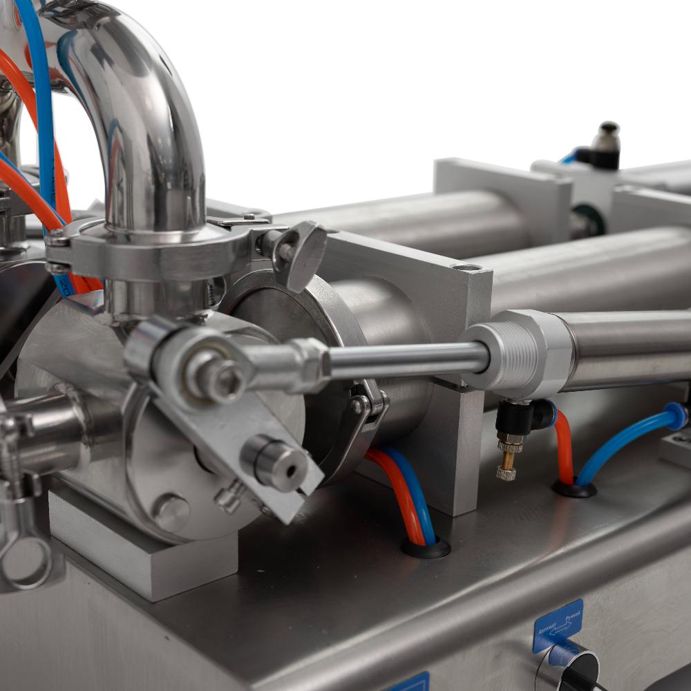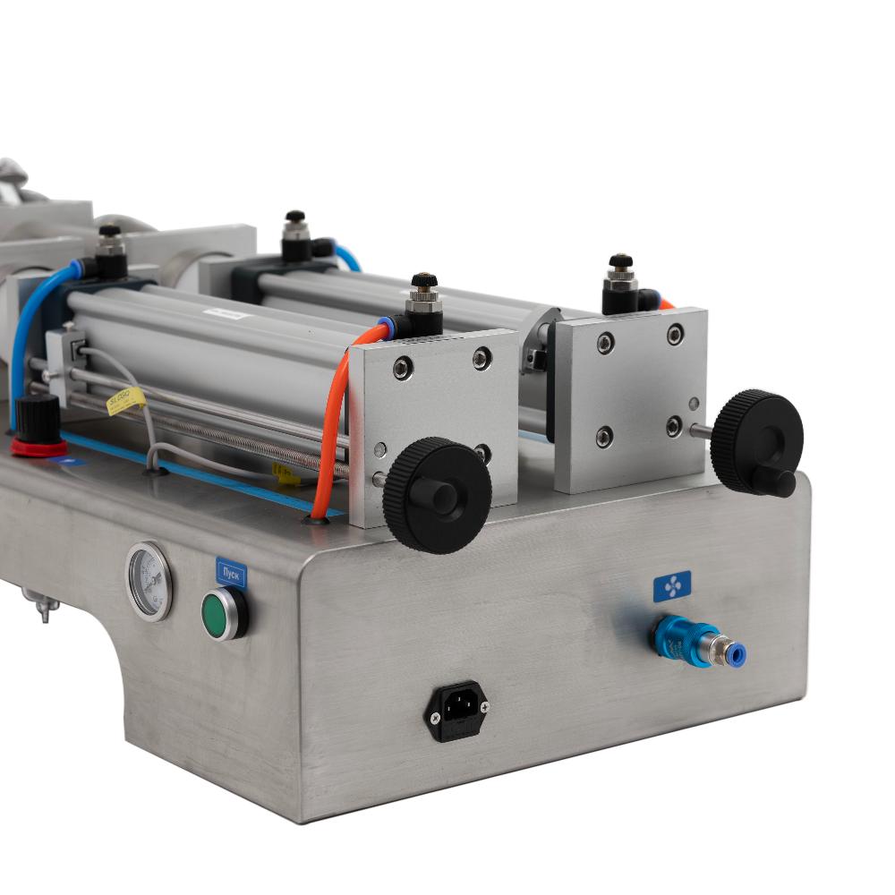 - Гибкая регулировка объёма и скорости. Ход поршня легко настраивается ручным колесом в диапазоне 100-1000 мл на каждую головку, а пневматические клапаны позволяют регулировать скорость наполнения и всасывания для оптимальной работы с различными продуктами.
